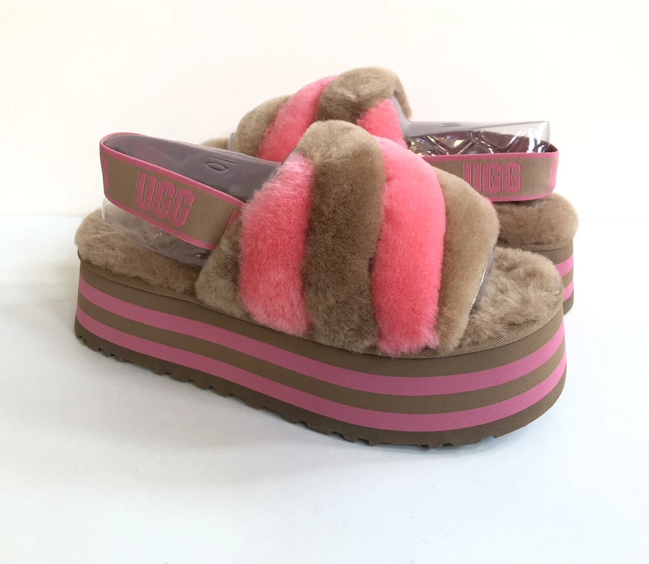UGG FLUFF YEAH DISCO STRIPE SLIDE CHESTNUT PINK ROSE SANDAL US 7 EU 38 UK 5