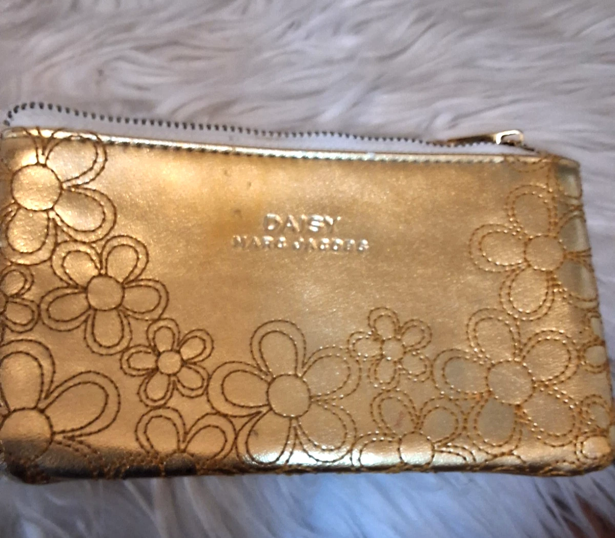 Elevate your accessory collection with the Daisy by Marc Jacobs Gold Pouch Bag Carrier Wristlet, a sleek and stylish choice for those seeking both elegance and practicality. The clutch design is accented with a chic gold exterior, complemented by a coordinating wristlet strap for easy carrying. The beige lining provides a subtle contrast, enhancing the pouch’s sophisticated aesthetic. Ideal for the fashion-forward woman, this small-sized pouch is adorned with a delicate floral pattern, adding a touch of femininity to any outfit. The gold hardware and strap add a luxurious finish to this Marc by Marc Jacobs piece, making it a versatile accessory for day-to-night wear.