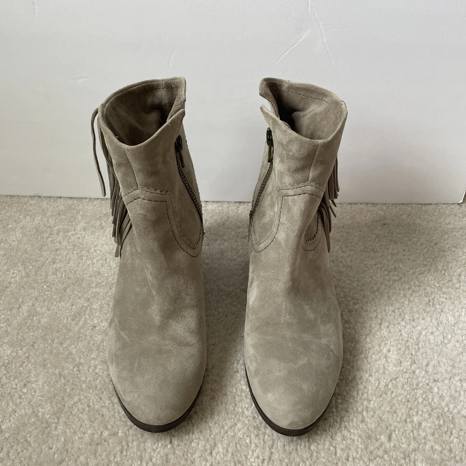 Elevate your style with these stunning Sam Edelman Louie fringe boots. These ankle boots come in a beautiful gray suede color with a solid pattern and a zip closure. The boots feature a mid-height block heel with a comfortable synthetic outsole that makes them perfect for any occasion, be it travel, party, casual or business.
