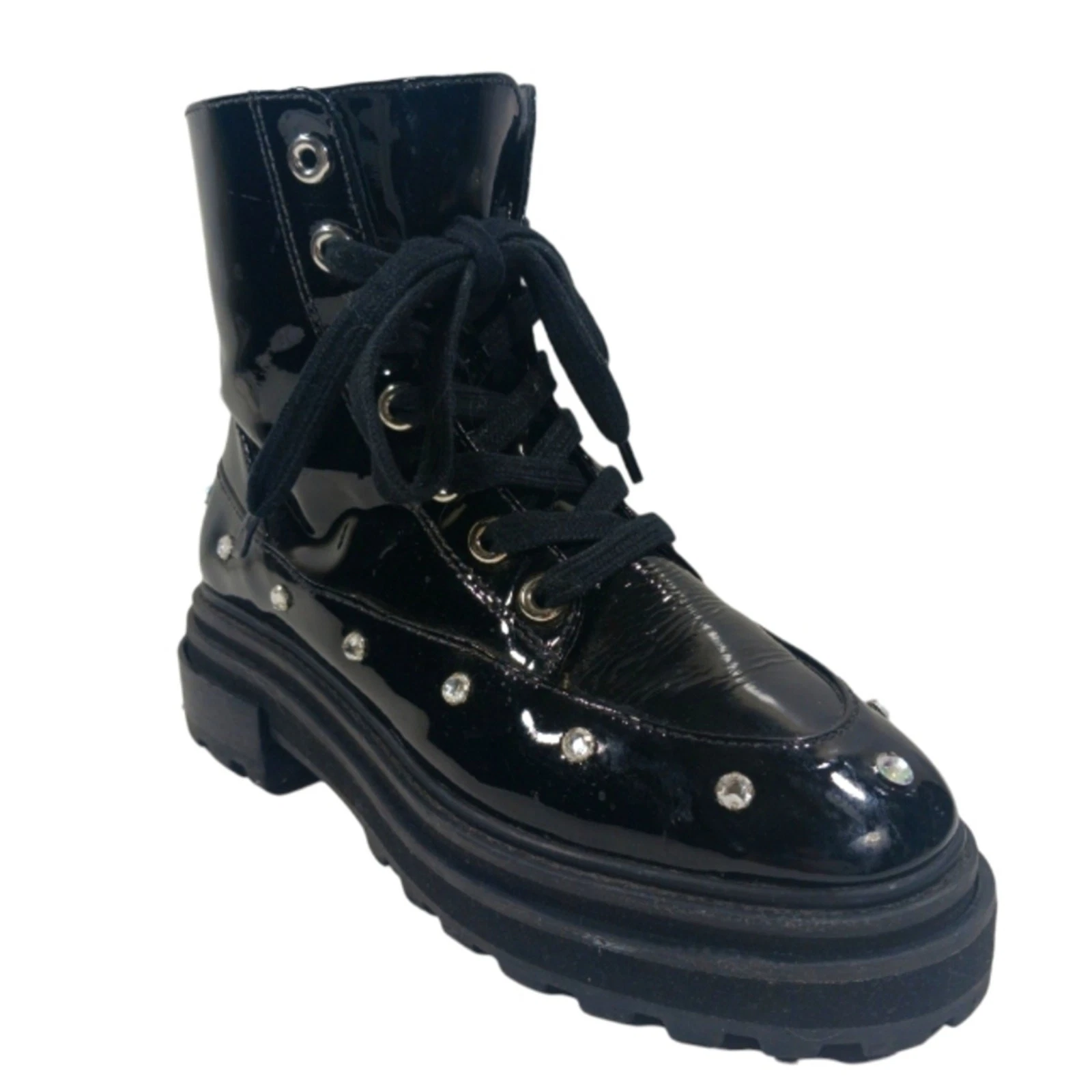 Elevate your look this season in these fierce yet sophisticated Schutz Abeli patent leather combat boots with crystal accents.
