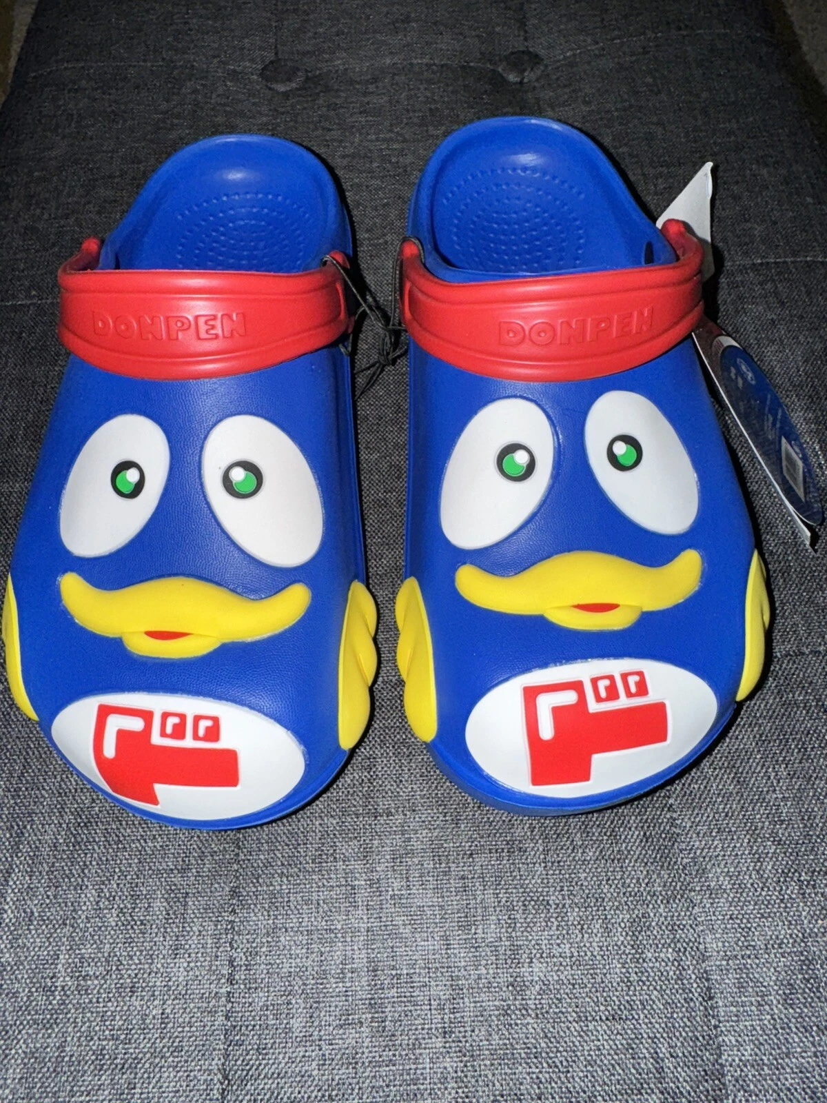 These Don Quijote Donko sandals are a limited edition release, perfect for any man looking to add a unique touch to their footwear collection. The slip-on style and thick sole make them easy to wear and comfortable for all-day use. The rubber outsole provides traction and durability, while the plastic upper material gives them a sleek and modern look. These sandals are made in Japan and come in a blue color, making them a great addition to any outfit. The US shoe size is 8 and the model is Don Quijote Donko.