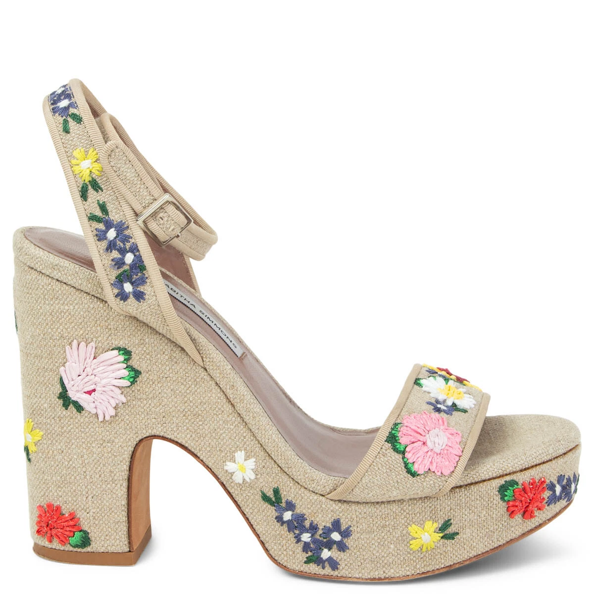 100% authentic Tabitha Simmons Calla Meadow in sand beige natural linen with multicolor floral embroidery. Ankle-strap closure, platform sole and chunky heel. Have been worn and are in excellent condition.