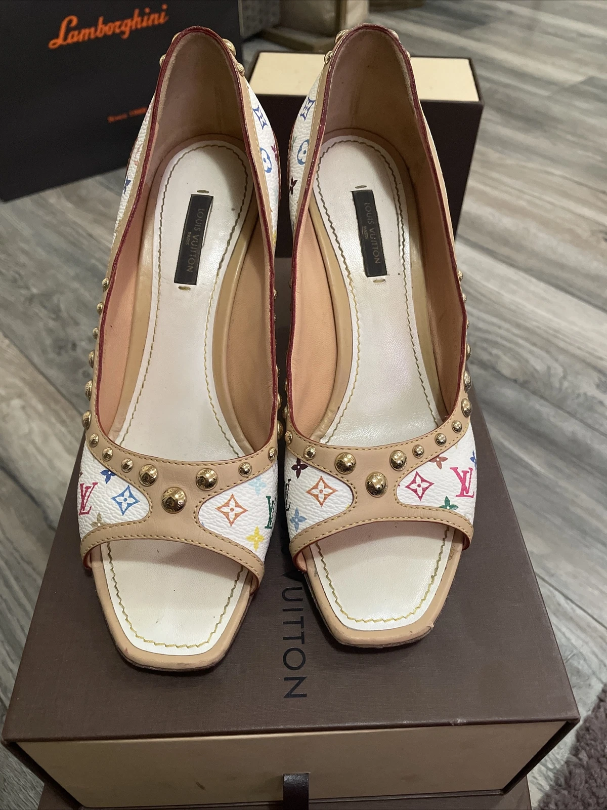These are extremely rare Louis Vuitton heels in a size 38.5. They feature a multicolor leather upper with an open toe design. The heels have a cone shape and a high heel height. The style is a pump named “Extreme.” These white shoes are vibrant and colorful, perfect for making a statement.