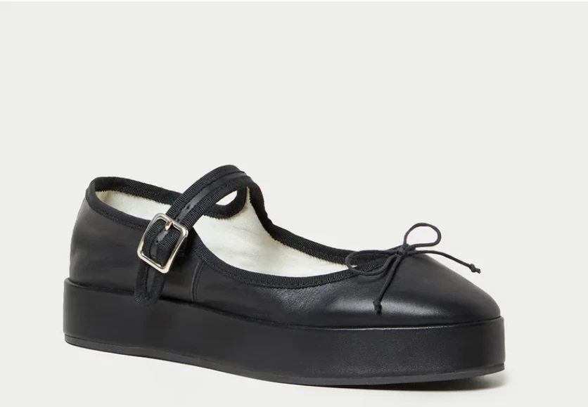 Mary jane flatform in black Italian glove calf leather with an adjustable bridge strap and bow detail. Features a padded footbed with gold stamped logo, an almond toe, and a buckle closure. 1 inch platform.