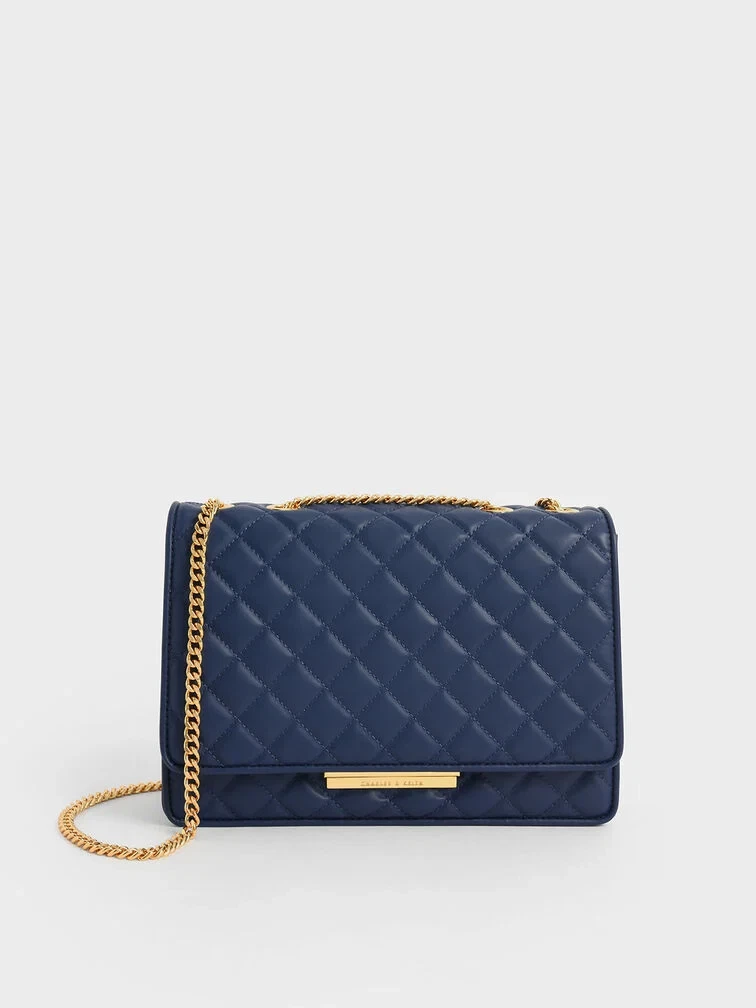 Elevate your style with this stunning Charles & Keith shoulder bag. The double chain handles and gold hardware add a touch of elegance to the navy faux leather exterior. The bag is quilted for a structured and durable design. With a clasp closure, this bag is perfect for everyday use or as a statement piece for a night out. The bag is 26cm in width and features a gold handle style. Vintage lovers will also appreciate this bag as it is not only modern but also has a vintage touch.
