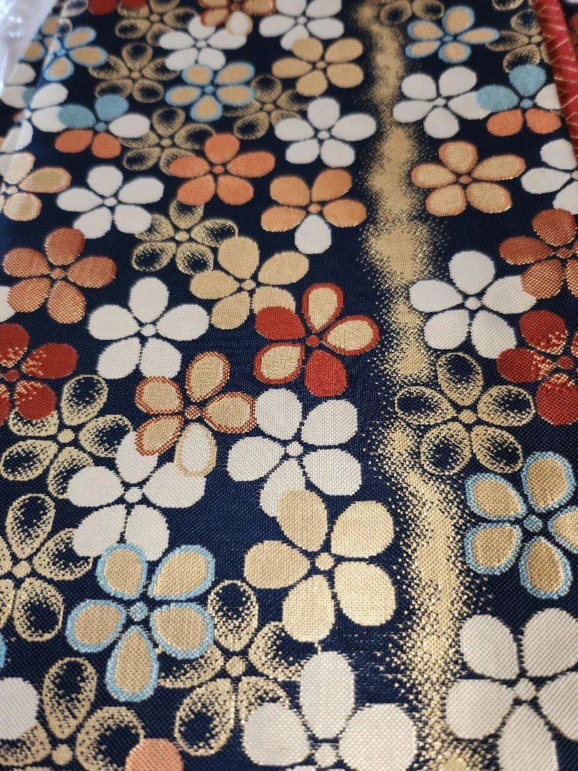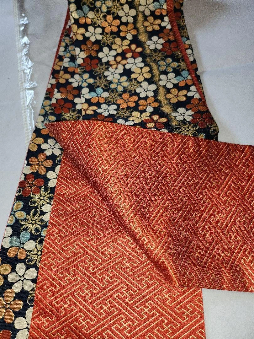 ✔ This vintage reversible half-width obi small bag features a charming floral pattern, perfect for traditional Japanese attire. Crafted with a beautiful navy base adorned with subtle sparkle and abstract floral designs, this accessory exudes elegance. The reverse side showcases a striking red color with intricate gold thread woven in a sash pattern, making it versatile for various kimono styles and occasions. Its long length of approximately 460 cm allows for creative and unique tying styles, especially suitable for decorative knots.