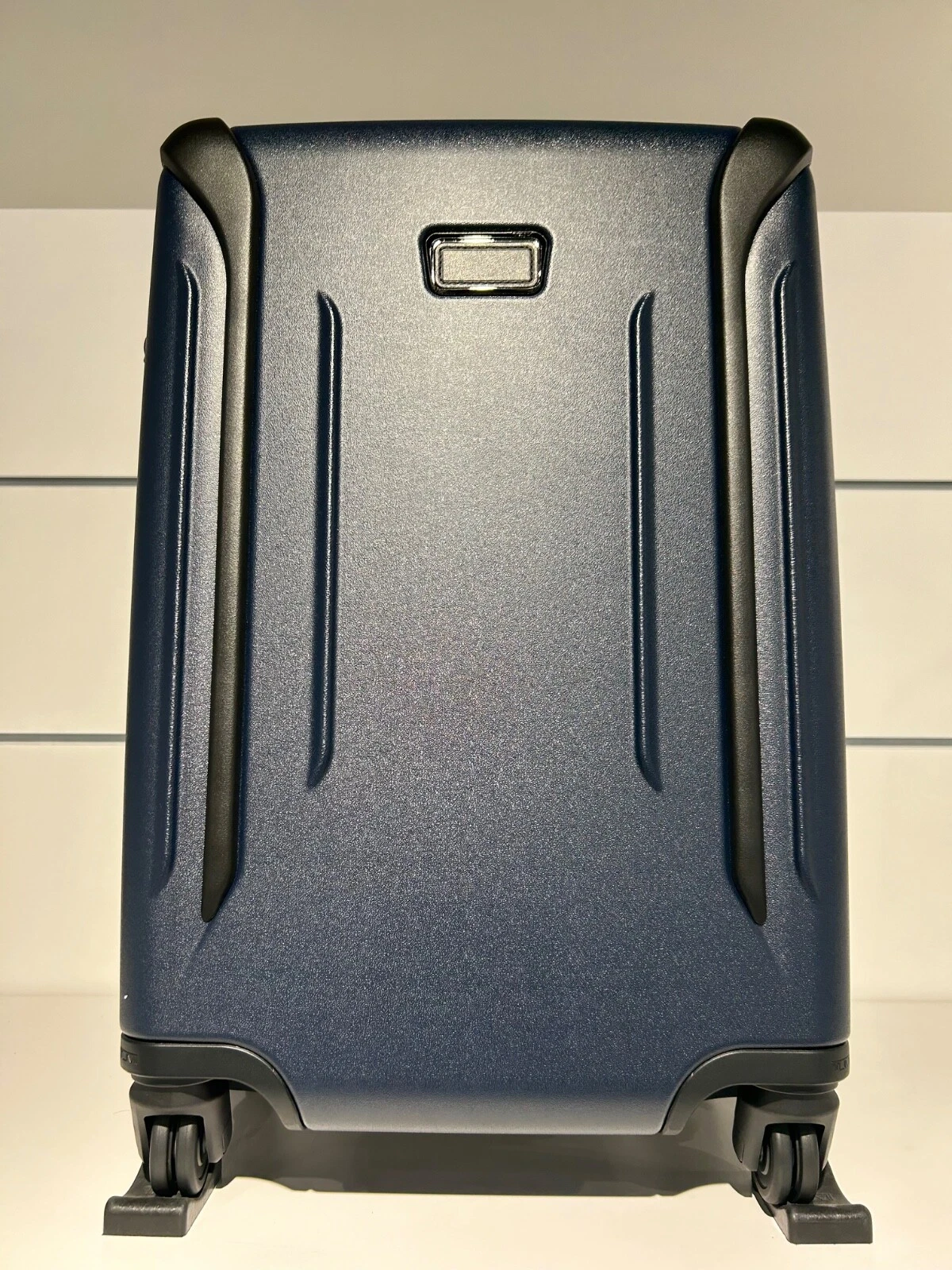 Done in a textured finish – Tumi is embossed at the backside – double spinning wheels and Inside each side of the case has zippered sides, so when opened your clothing and contents do not fall out.