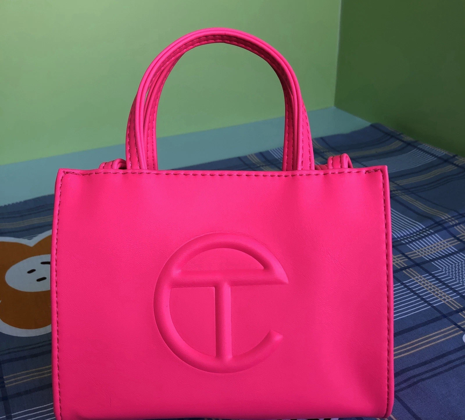 The Telfar Small Shopping Bag in Azalea Pink is an authentic accessory designed for women. With a small size and a magnetic snap closure, this crossbody bag features a colorful logo pattern on the faux leather exterior. The pink handle/strap, silver hardware, and black lining add a stylish touch to this fashionable bag. Perfect for carrying essentials in a trendy and vibrant way, the Telfar Small Shopping Bag is a must-have for any fashion-forward individual.