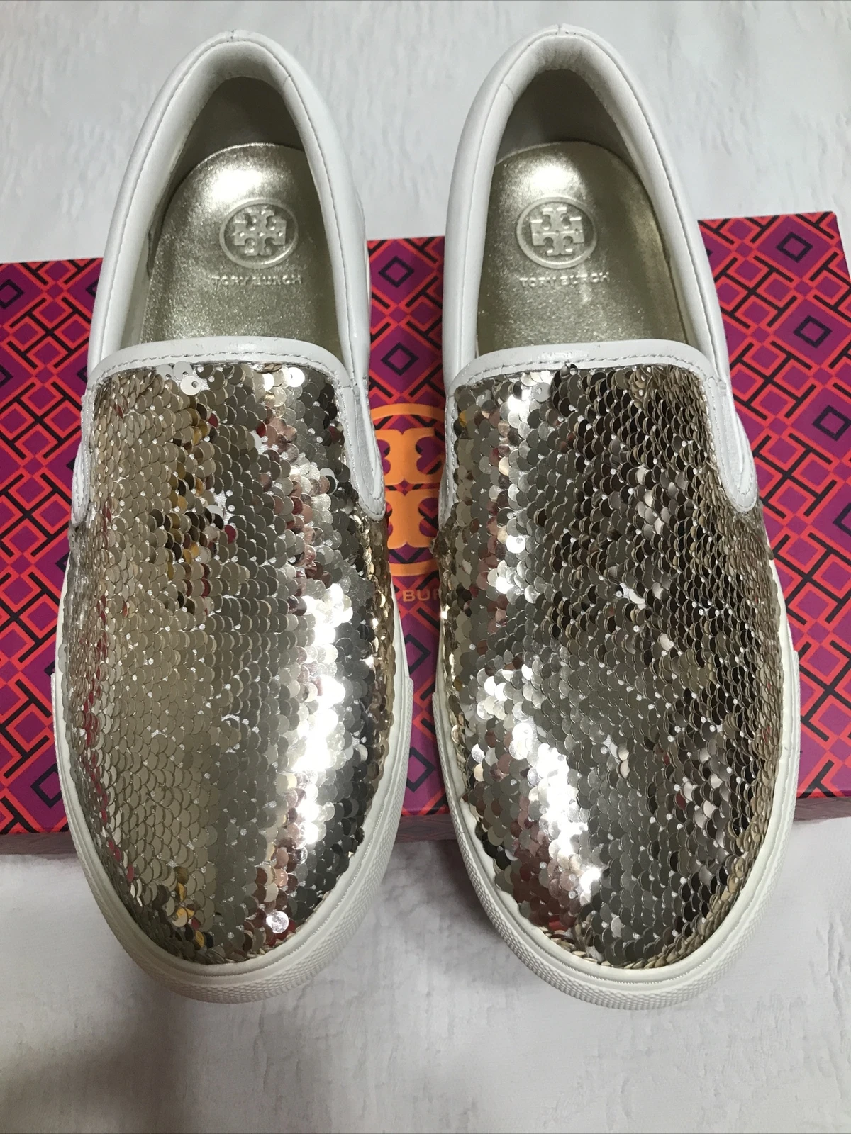 NIB Tory Burch Carter Slip-On Sneaker US 7 AUTHENTIC. Color Sparkle Gold/Snow White. Condition is New with box. Tory Burch box is included but doesn’t match with the shoes. There is a small mark on the inner side of the right shoes. Please, see picture #8. Shipped with USPS Priority Mail.