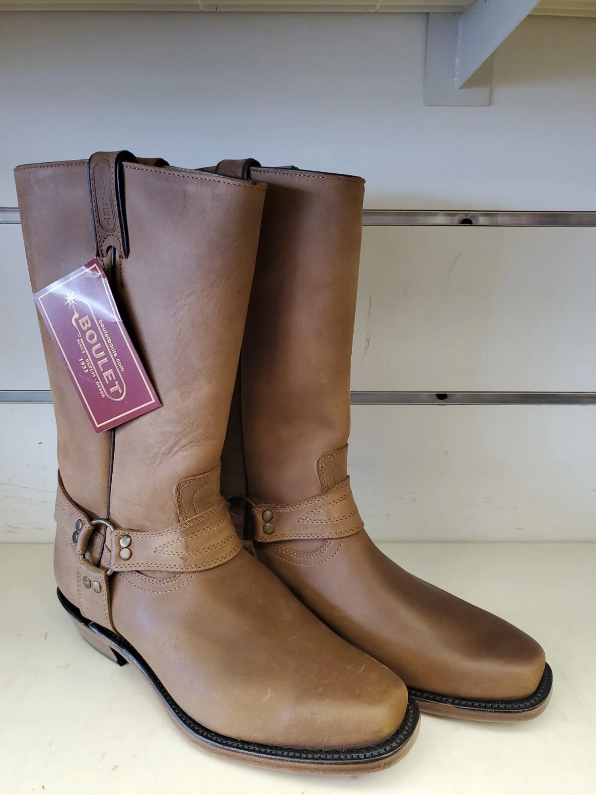 Boulet 5077 women’s brown leather motorcycle boots with a vagabond toe shape. These boots come with a pull-on closure and feature straps and a stockman low heel style. The outsole material is made of a combination of leather and rubber, while the upper and lining materials are 100% leather. These boots are perfect for travel, casual wear, and workwear, and can be worn in all four seasons.