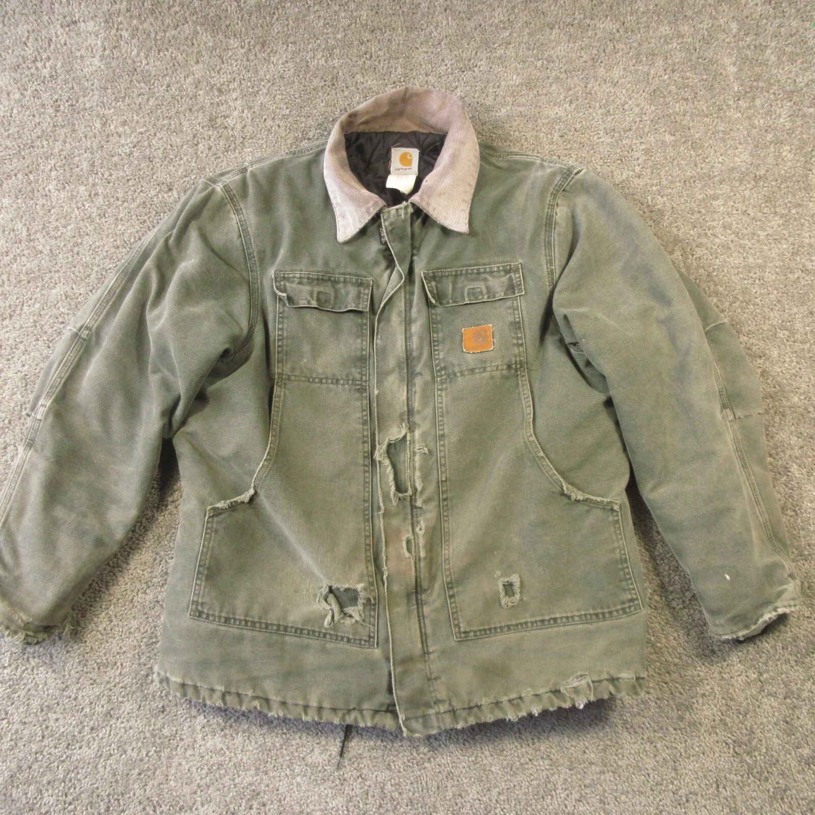 Embrace the classic workwear aesthetic with this vintage Carhartt C26 jacket. Designed for durability and comfort, the jacket features a robust cotton canvas outer shell with a warm nylon lining. The quilted insulation provides additional warmth, making it an ideal choice for fall, spring, and winter. This mid-length jacket comes in a striking green color, accented with the iconic Carhartt logo and a spread collar that adds a touch of sophistication to the overall design. It’s equipped with a full zip closure, multiple pockets for convenience, and is machine washable for easy care. Whether you’re working outdoors or enjoying a casual walk, this jacket offers both style and functionality.