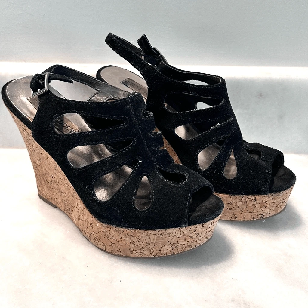 Steve Madden Womens Cork Wedge Adjustable Strappy Sandals Suede Black Size 6.5