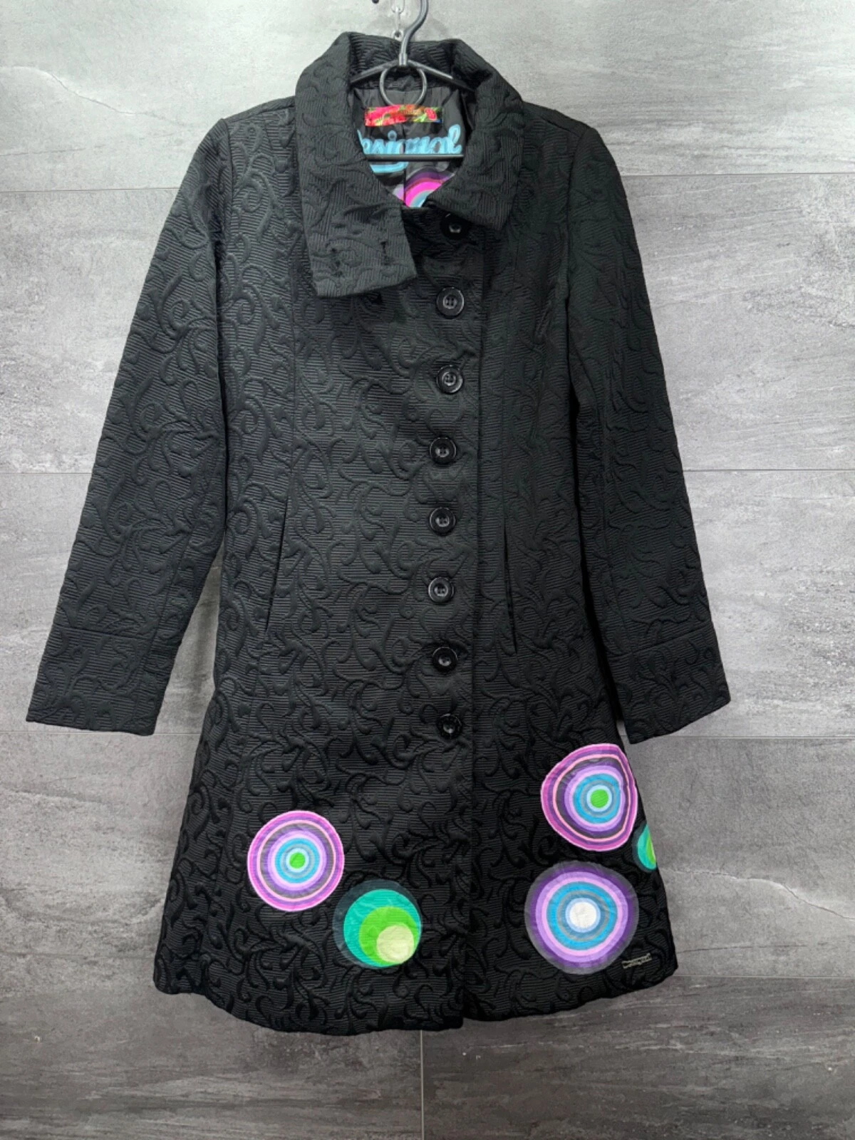 Item specificsConditionPre-owned – GoodSeller Notes“Condition used”BrandDesigualOuter Shell MaterialCottonSize TypeRegularDepartmentWomenTypeJacketSize38ColorMulticolorStyleTrench CoatItem description from the sellerCondition:Pre-owned – GoodPre-owned – Good“Condition used”Pre-owned – GoodThis item has been gently used but is in good condition. It might have a few signs of wear, but all imperfections should be shown and described in the seller’s…