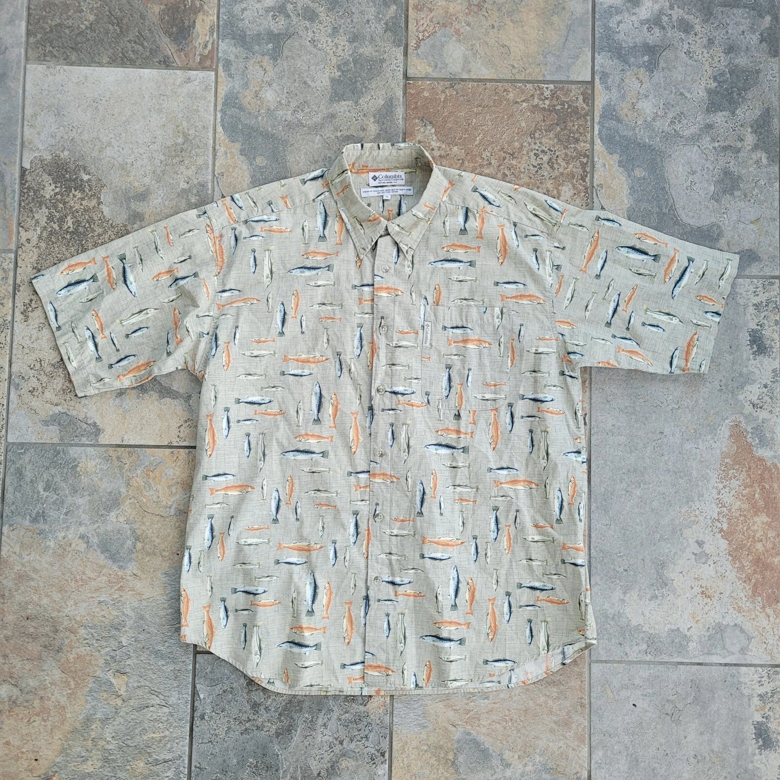 Columbia Men’s Size XL Button Down Short Sleeve Fish Print Gray Shirt. 100% cotton. Style: S3 AM7828. Brand fabric tag on left breast pocket.