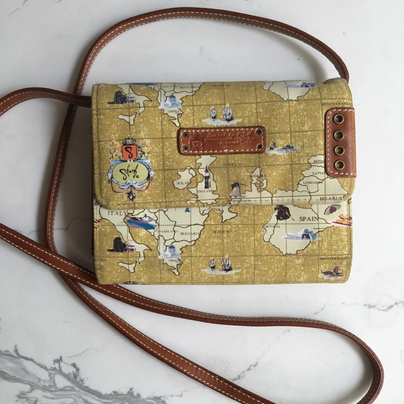 Travel by Sharif Map Print Shoulder Crossbody Bag Tan Yellow Leather Trim RARE