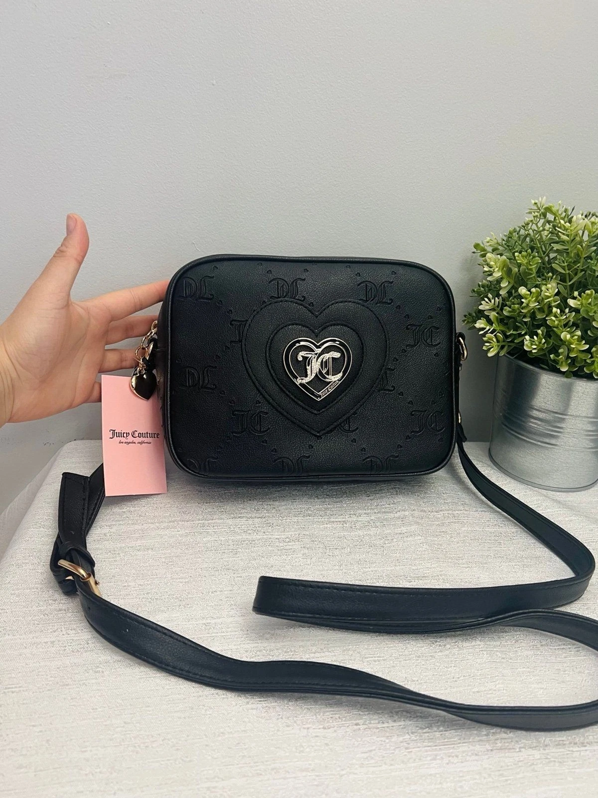 This stylish Juicy Couture “Only You N Me” Camera Crossbody Bag in classic black is the perfect accessory for a chic and functional look. The bag features a sophisticated heart design with a metal JC logo in the center, adding a touch of elegance.