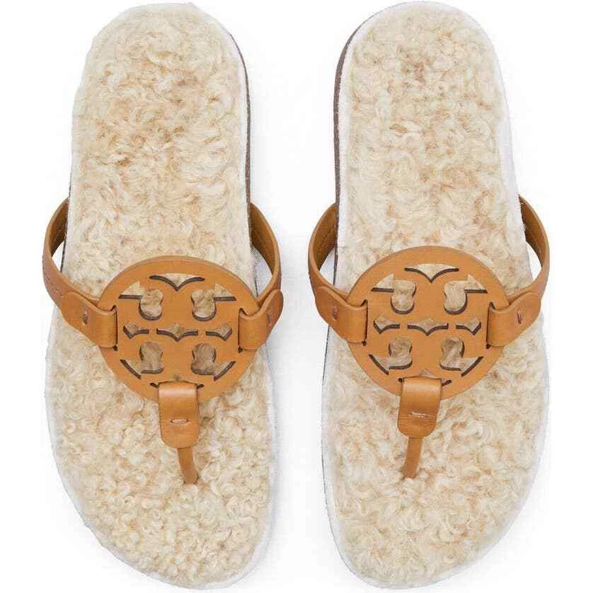Tory Burch Miller Cloud Genuine Shearling Flip Flop Flats Sandals Size 8. Plush shearling lining and arch support keep you comfy in this flip-flop highlighted by the double-T logo in high-shine leather. Leather upper/genuine shearling (Vietnam) lining/rubber sole. Imported.